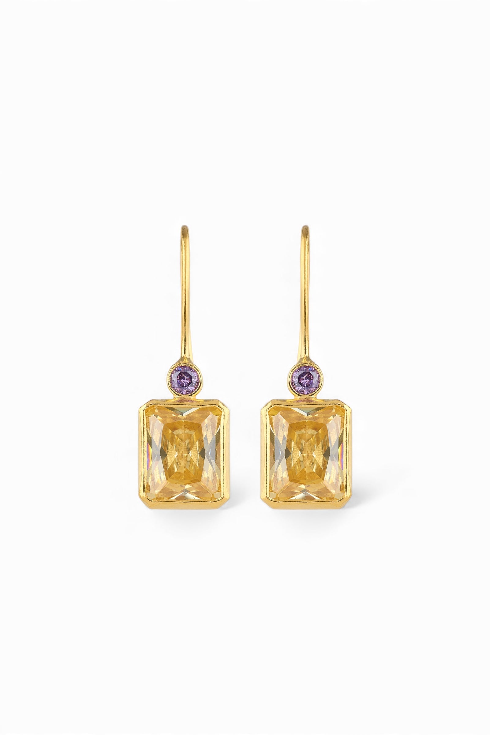 Tasarım ve Taş Detayları: Dikdörtgen formda sarı zirkon taşlar ve yuvarlak formda mor tonlu zirkon taşlar, mikron kaplama çerçeve ile tasarlanmıştır.