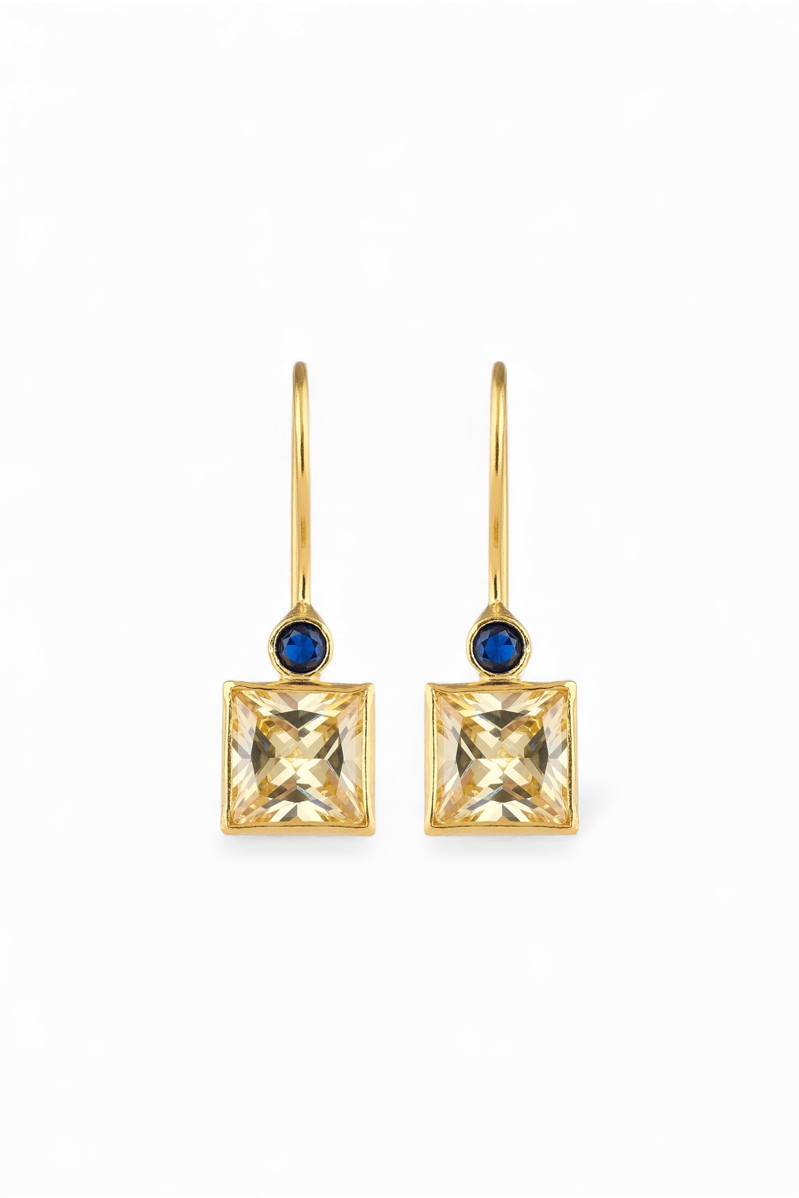 Tasarım ve Taş Detayları: Kare formda sarı zirkon taşlar ve yuvarlak formda lacivert tonlu zirkon taşlar, mikron kaplama bir çerçeve içinde tasarlanmıştır.