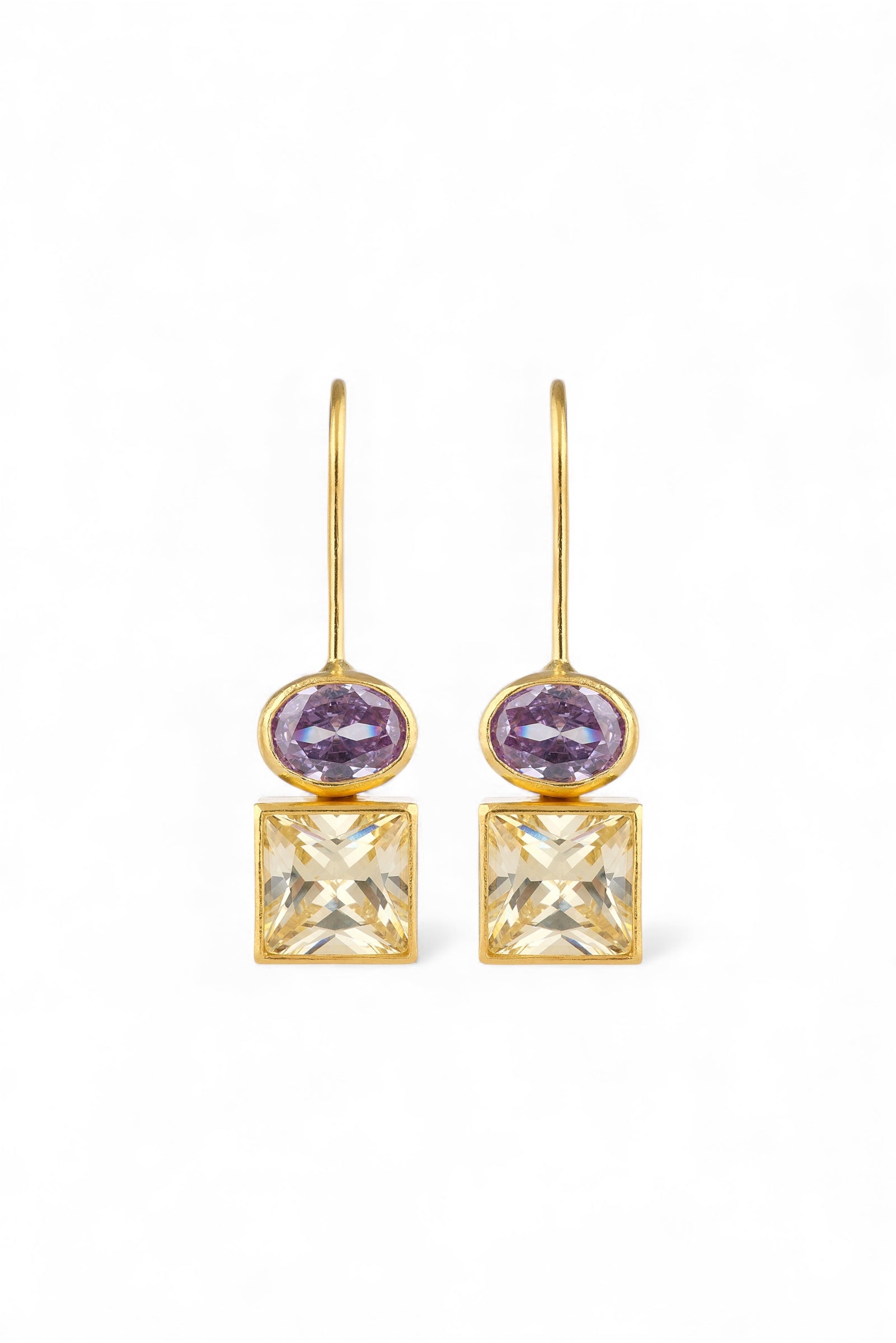 Tasarım ve Taş Detayları: Kare formda sarı zirkon taşlar ve yuvarlak formda mor tonlu zirkon taşlar, mikron kaplama bir çerçeve içinde tasarlanmıştır.
