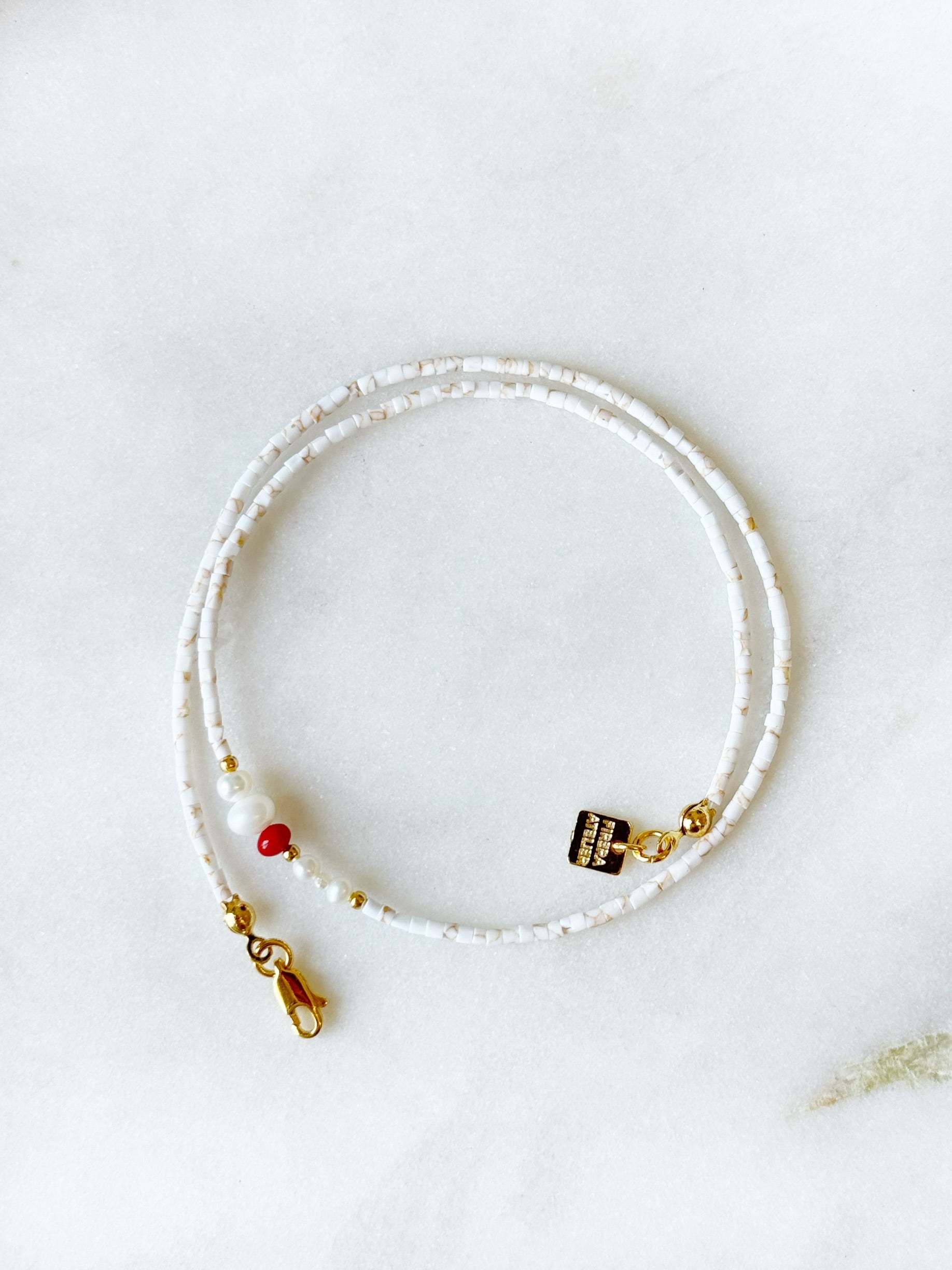 Malzeme: Doğal taş, mercan, inci, pirinç üzeri altın kaplama detaylarla tamamlanarak tasarlanmıştır.