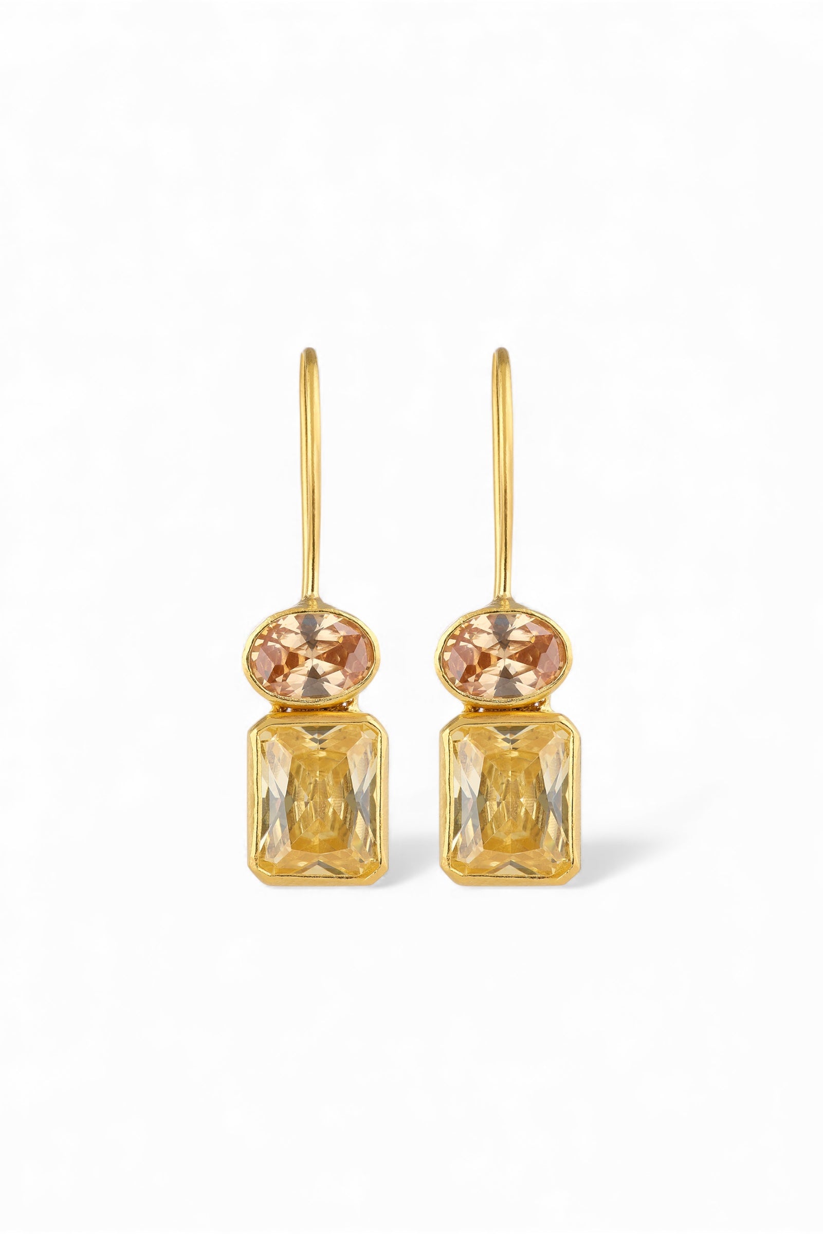 Tasarım ve Taş Detayları: Oval formda sarı zirkon taşlar ve yuvarlak formda şampanya tonlu zirkon taşlar, mikron kaplama bir çerçeve içinde tasarlanmıştır.