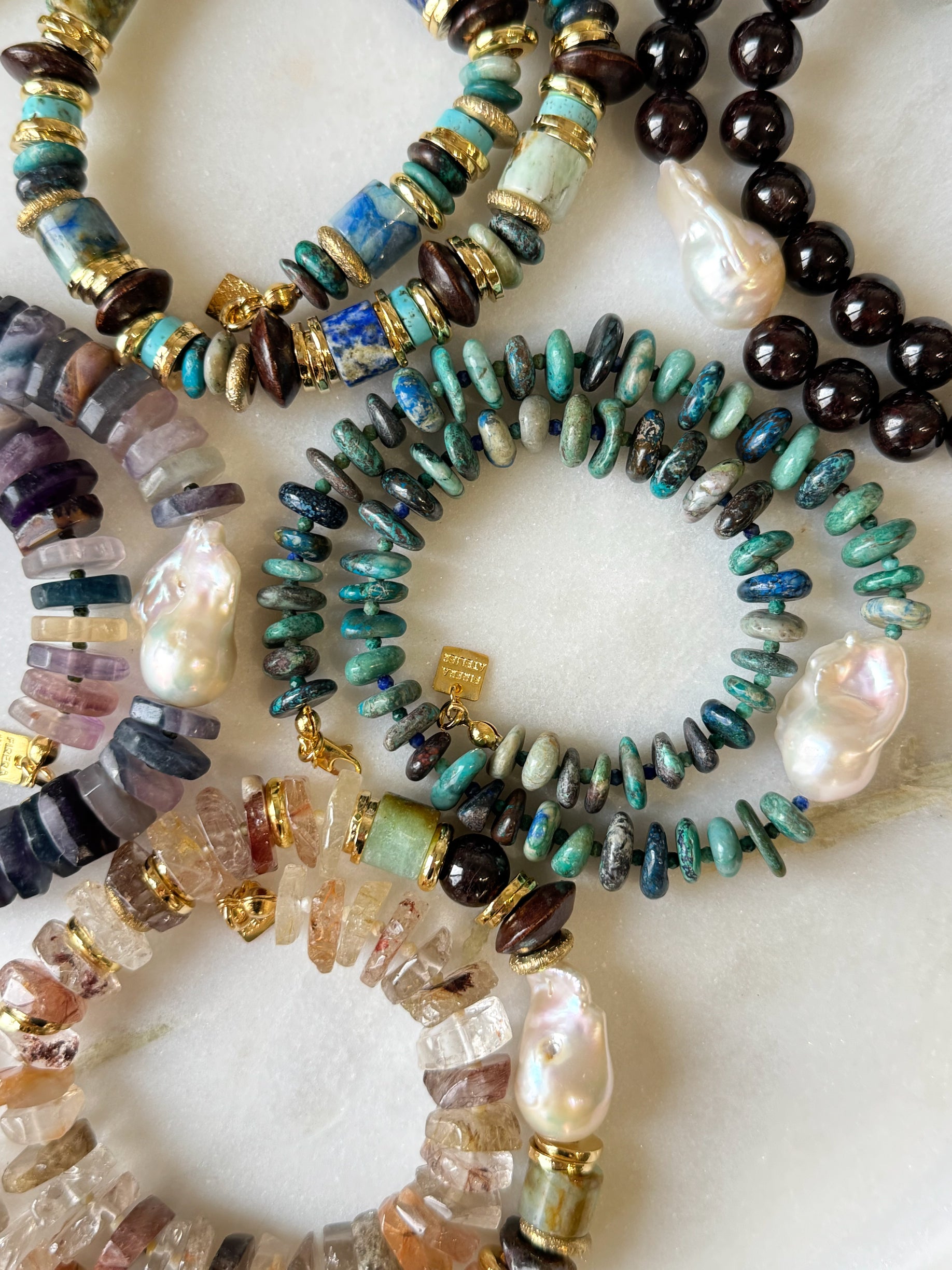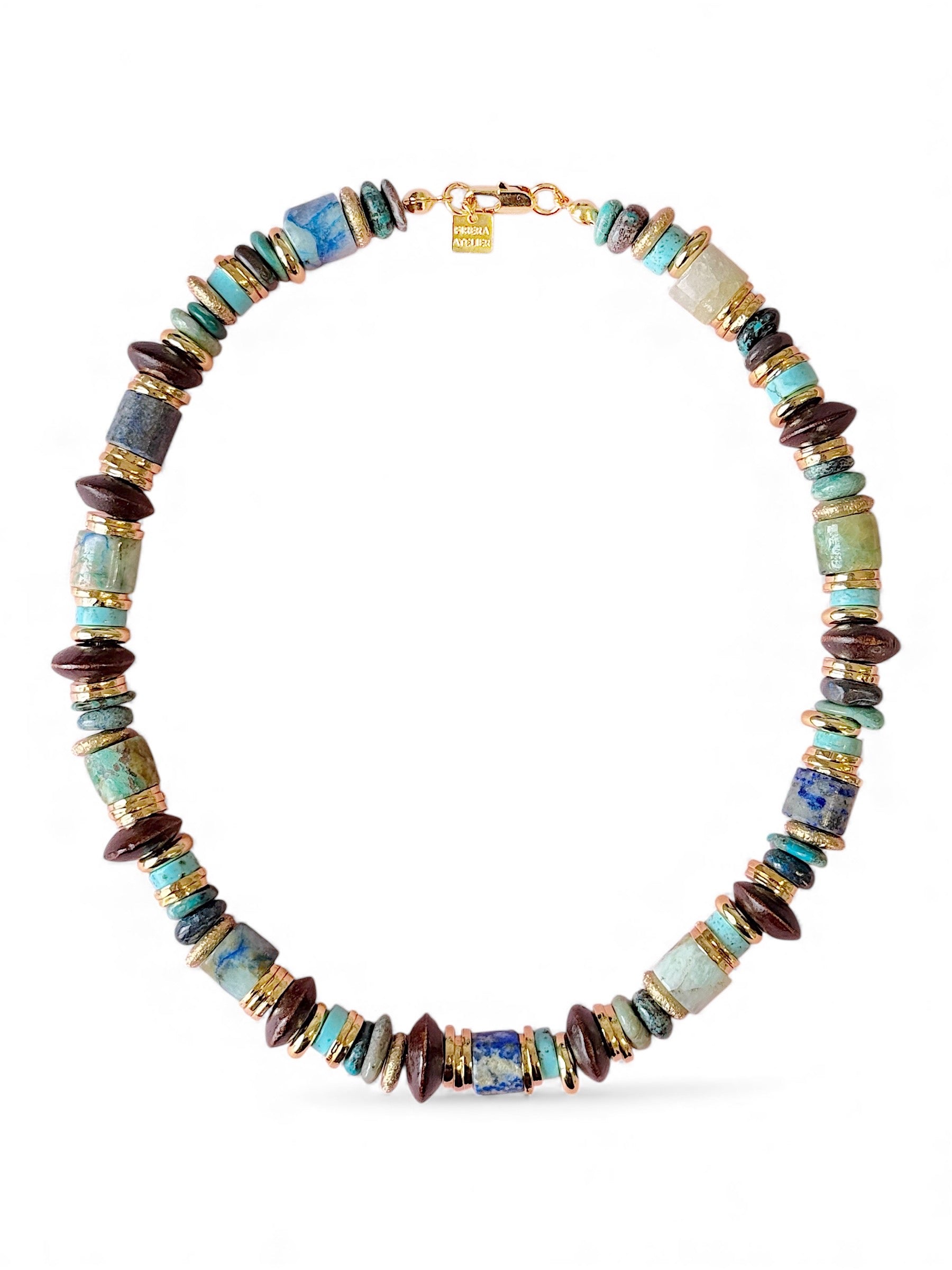 • Malzeme: Krizokol, azurit, lapis lazuli, amazoçite doğal taş, pirinç ve altın kaplama