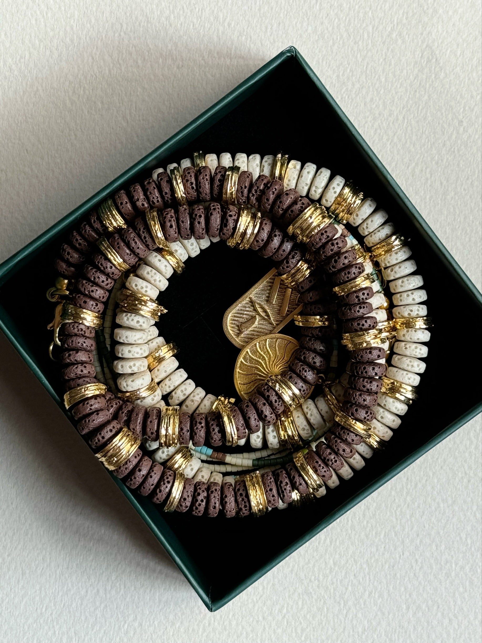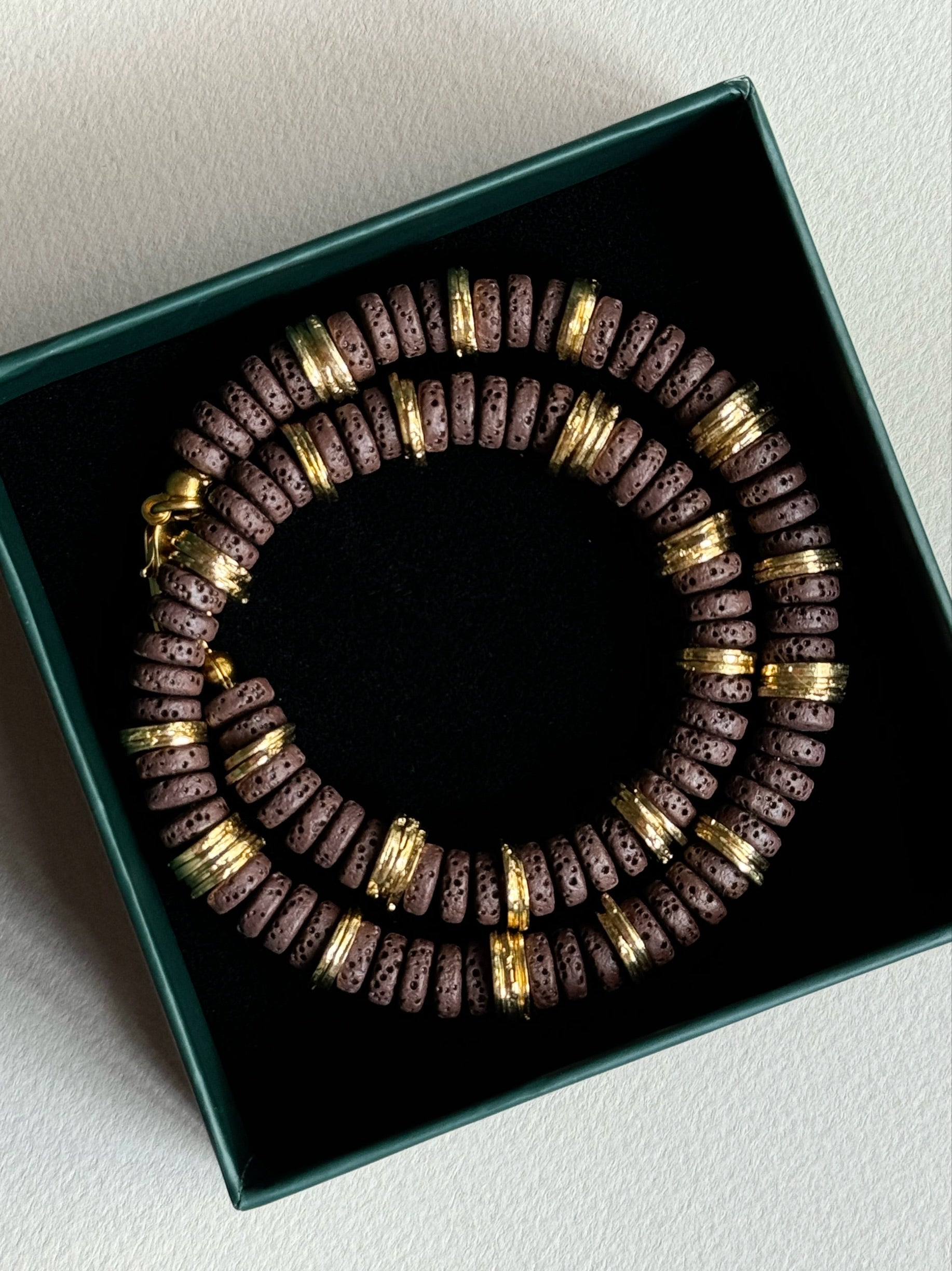 • Malzeme: Lav taşı, pirinç ve altın kaplama