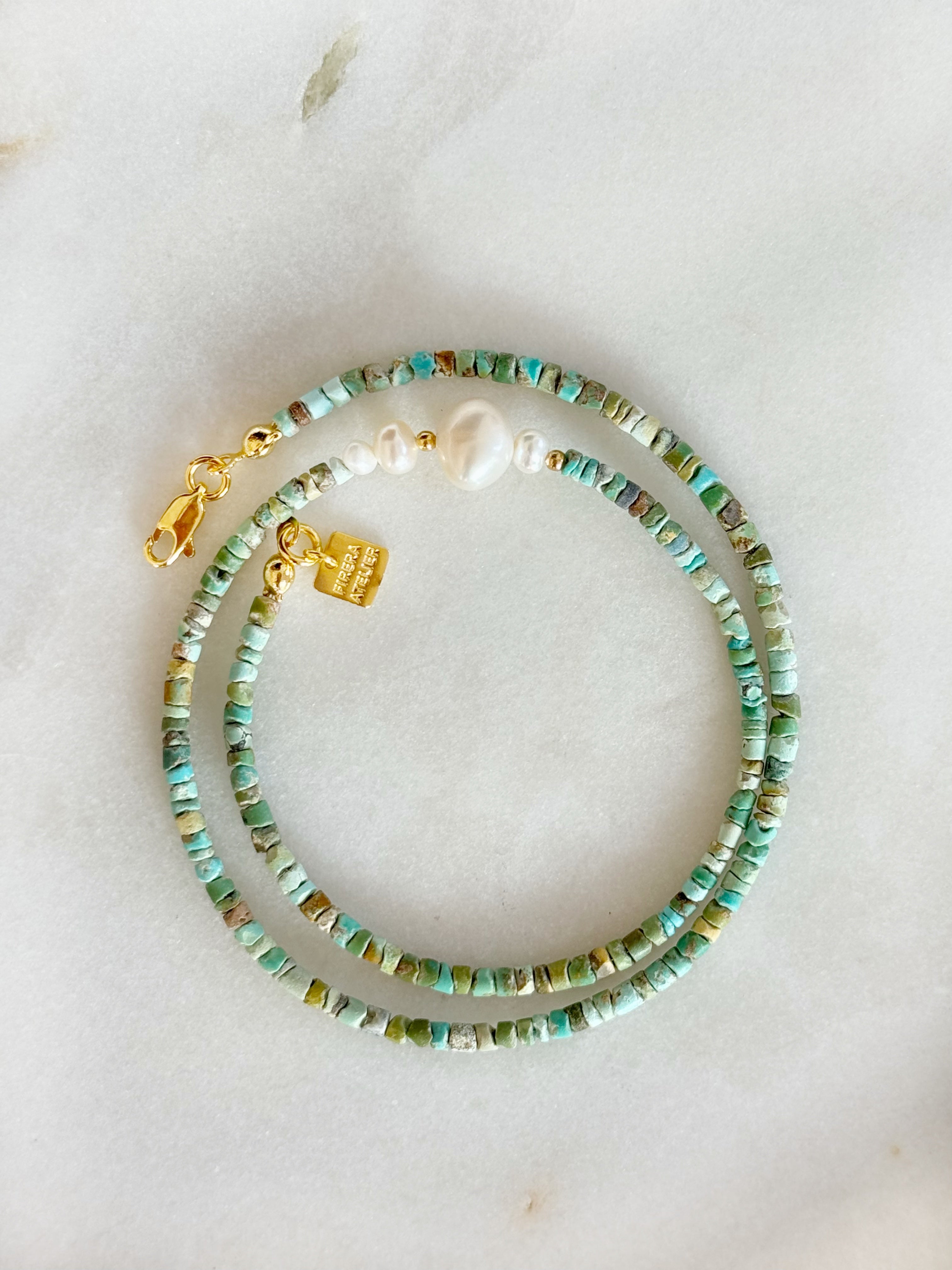 • Malzeme: Turkuaz doğal taş, inci, pirinç ve altın kaplama
